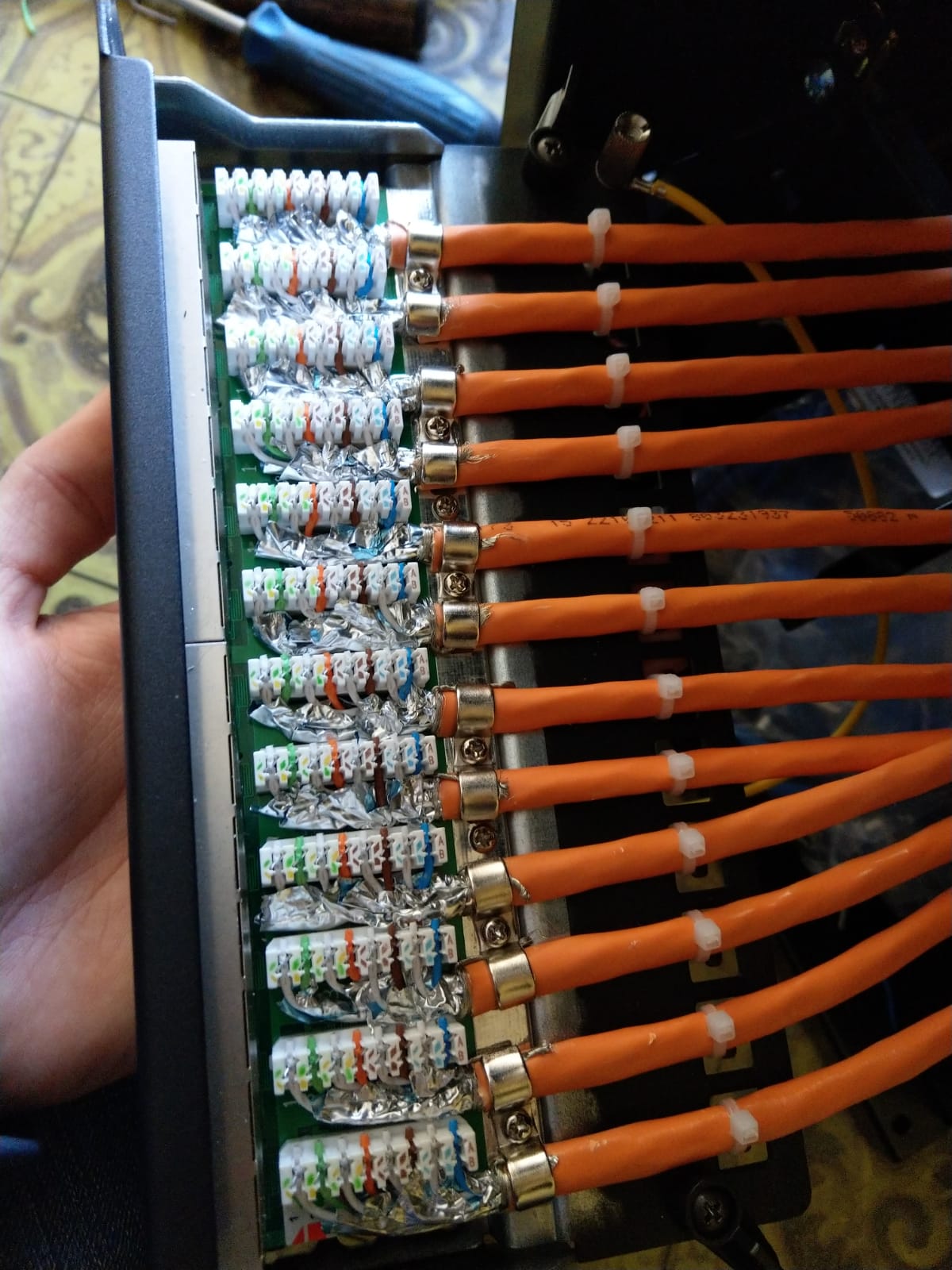 Aufgrund dessen sollten auch beim Auflegen der Adern auf dem Patchpanel und auf den Netzwerkdosen, die Schirme soweit wie möglich erhalten bleiben. Siehe die Bilder meines zuletzt aufgelegten 10 Zoll Patchpanels.